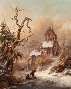 Winter Landscape With Skaters And A Covered Wagon Near A Church