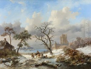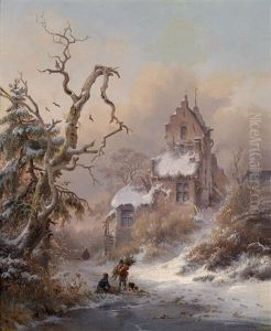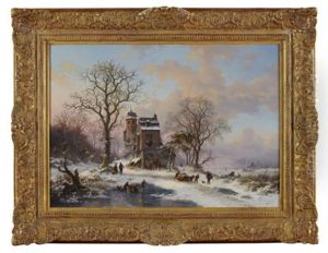 An Idyllic Winter Scene With Woodgatherers Near A Castle