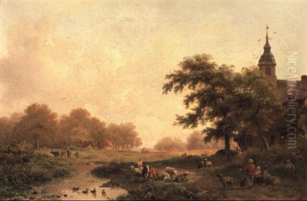 A River Landscape With Cows And Sheep Oil Painting by Frederik Marinus Kruseman