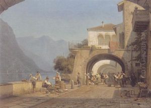 Byparti Fra Italien, Med Handesliv Ved Byport, I Bagrunden Flod