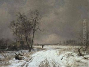 Vinterlandskab Med Kone Og Barn Pa Vej Over Isen