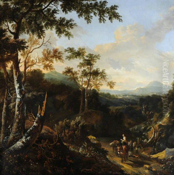 A Wooded Landscape with Peasants and Donkeys on a Path