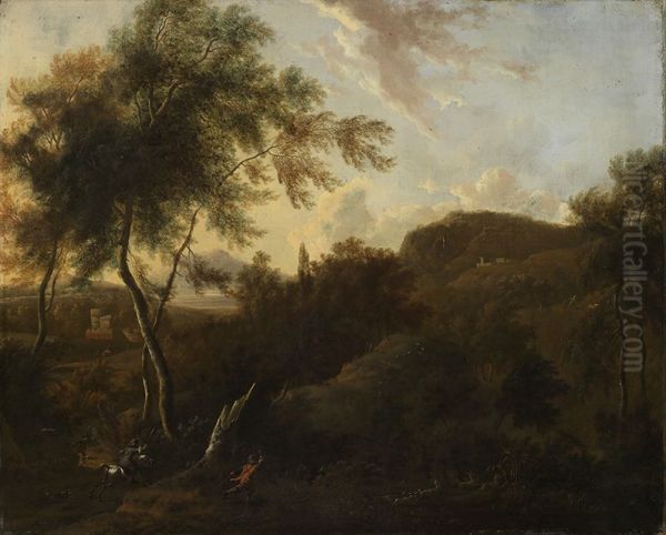 Sudliche Landschaft mit einem Jager auf Hirschjagd