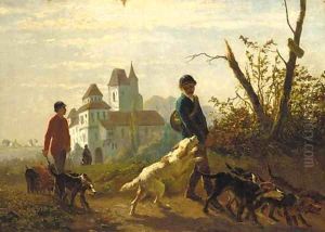 An Italianate landscape with figures on a path, a castle beyond