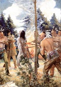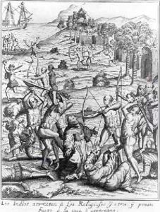Indians on the road to conversion by the Spanish: meekly presenting themselves for baptism by Friars Angel and Martin de Jesus and the punishments for crimes such as witchcraft, licentiousness, and murder, from the Cronica de Mechoacan