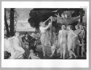 Italienischer Garten mit Zypressen, Villa und weiblicher Gestalt