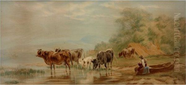 Cattle Drinking, With Herder Sitting On Boat