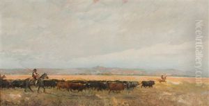 Cows At The River With Herdsmen Resting Under A Tree.