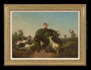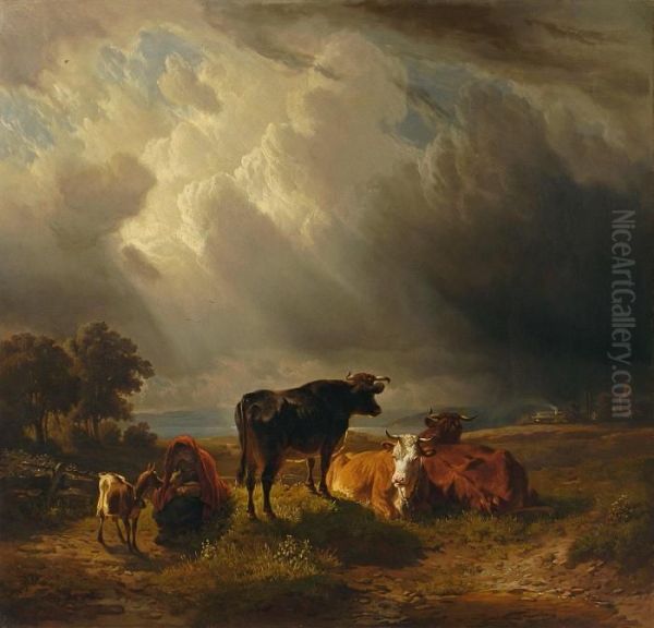 Hirtin Mit Zicklein Und Kuhen In Gewitterlandschaft