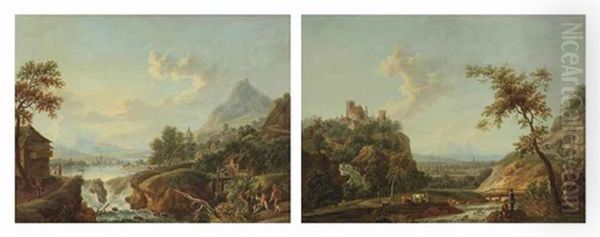 A Mountainous River Landscape With Cowherds Watering Their Cattle Near A Stream, A Castle Beyond (+ A Mountainous Riverlandscape With Figures On A Track Near A Waterfall; Pair)