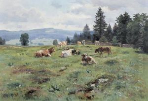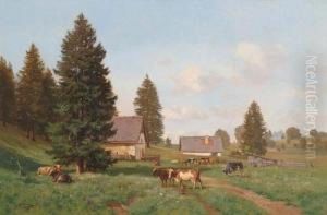 Alpenlandschaft Mit Weidenden Kuhen.