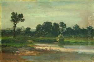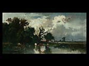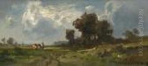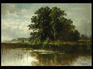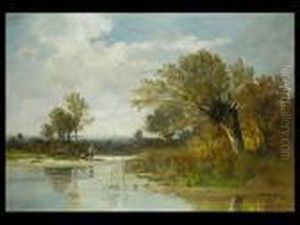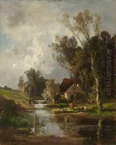 Hirte Mit Zwei Kuhen Am Baumbestandenen Ufer