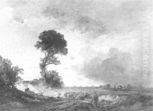 Herbstlandschaft Mit Einem Schafer Und Seiner Herde Im Hohlweg Vorn