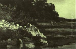 Herbstlandschaft Mit Einer Gansehirtin Am Ufer Des Wassers Links