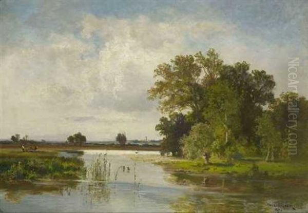 Uferlandschaft Mit Pflugendem Bauer