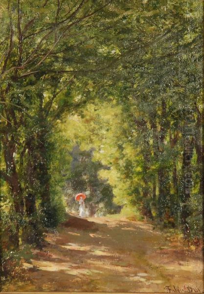 Paesaggio Boschivo Con Signora Con Ombrellino Rosso