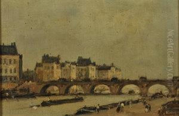 Continental River With Barges And Figures Before A Bridge