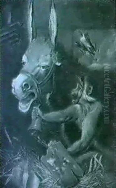 A Monkey With Pallett And Brushes Ringing A Bell Hung Around The Neck Of A Braying Donkey