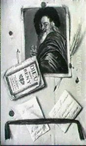 Trompe-l'oeil: Portrait D'homme Et Lettre Et Plume D'oie Retenues Par Un Ruban Rouge