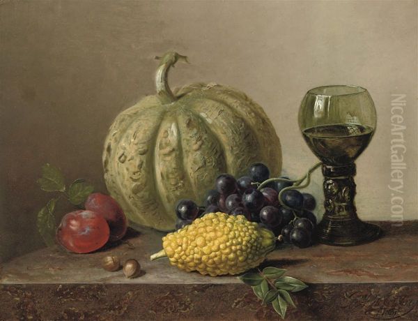 A Pumpkin, Grapes, Prunes And A Roemer On A Marble Ledge