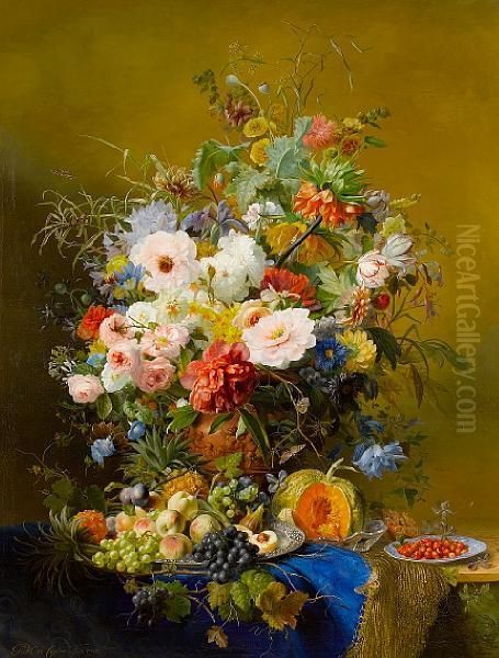 A Still Life Of Peonies, Roses, Poppies,tulips And Other Flowers With Mixed Fruits On A Marble Ledge With Ablue Cloth