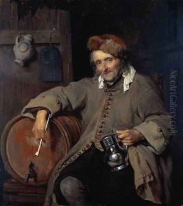 An Interior With A Gentleman Drinking And A Lady Sewing