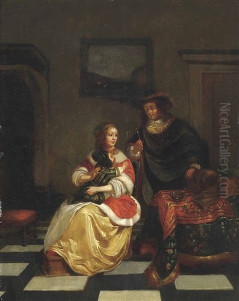 An Elegant Couple With A Child In An Interior Oil Painting - Gabriel Metsu
