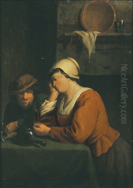 Interieur Mit An Einem Tisch Sitzendem Bauernpaar Oil Painting - Gabriel Metsu