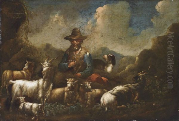 A Herder With Sheep, Goats And A Dog In An Mountainous Landscape