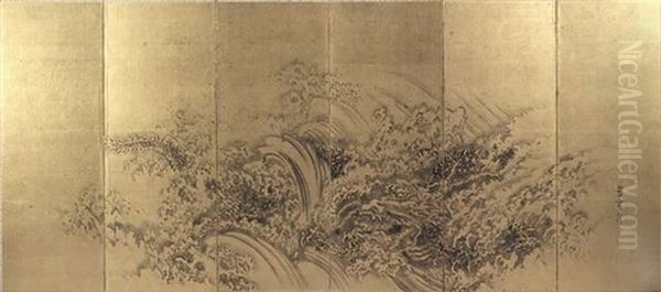 Tiger Im Schatten Einer Kiefer (+ Zwei Drachen In Gischt Und Wogen; 2 Works In 6 Panels)
