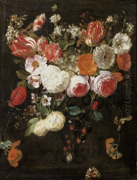 Bring the timeless beauty of Gaspar Peeter Verbruggen the Elder's STILL LIFE WITH ROSES, TULIPS AND OTHER FLOWERS IN A VASE TOGETHER WITH BLACKBERRIES AND A MOTH into your home with a handmade oil painting reproduction. Carefully recreated on canvas by skilled artists using traditional techniques, this piece captures the delicate brushwork, subtle light, and vibrant color of the original masterpiece. With museum-level quality and rich texture, it brings elegance and artistic depth to any space. Enjoy free shipping and make this masterpiece a part of your personal collection.