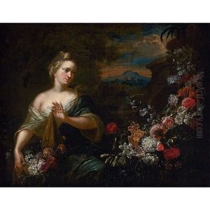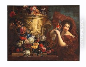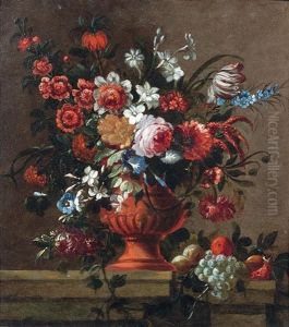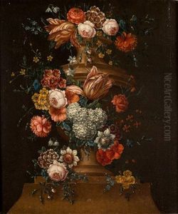 A Tulip, Jasmine, Chrysanthemums, Narcissi, Ivy And Various Other Flowers Decorating A Feigned Stone Cartouche; And Roses, Morning Glory, Jasmine, Narcissi, Poppies, A Tulip, Ivy And Various Other Flowers Decorating A Feigned Stone Cartouche