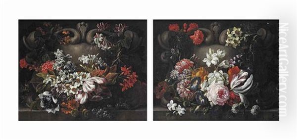 A Tulip, Jasmine, Chrysanthemums, Narcissi, Ivy And Various Other Flowers Decorating A Feigned Stone Cartouche; And Roses, Morning Glory, Jasmine, Narcissi, Poppies, A Tulip, Ivy And Various Other Flowers Decorating A Feigned Stone Cartouche Oil Painting by Gaspar Pieter Verbruggen the Younger