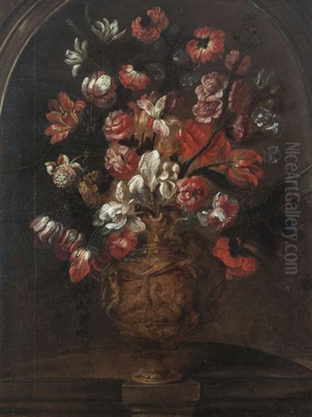 Tulips And Other Flowers, In Mannerist Ewers Set In Niches (a Pair)