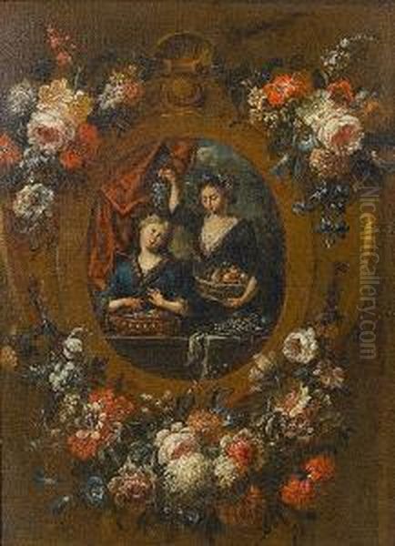 A Young Woman With A Vase Of Flowers, Another Holding A Bail Of Hay, In A Stone Cartouche Surrounded By A Garland Of Flowers; And A Young Woman Warming Her Hands, Another Holding A Basket Of Fruit In A Stone Cartouche Surrounded By A Garland Of Fl