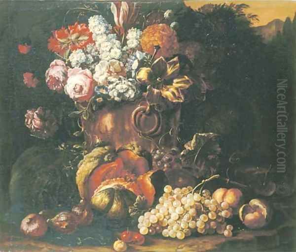 A still life of flowers in a bronze vase, with a melon, grapes, peaches and other fruit on a forest floor