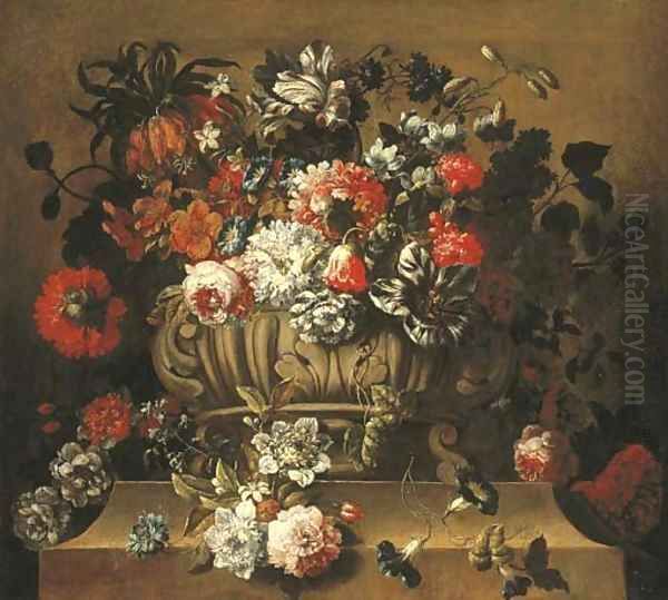 Tulips, a crown imperial lily, morning glory, roses, a peony and other flowers in a sculpted urn on a stone ledge