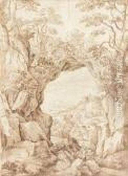 Paysage Au Travers D'une Arche Plume Et Encres Brune Et Noire Sur Trait De Sanguine, Lavis Brun