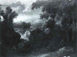An Extensive Italianate Land- Scape With Figures Before A Waterfall