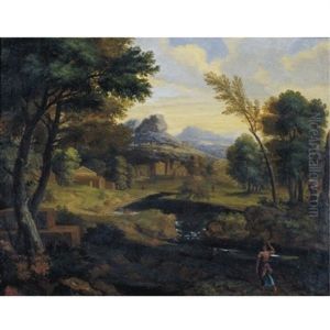 An Italianate Wooded Landscape, With Figures By A Stream And Buildings Beyond