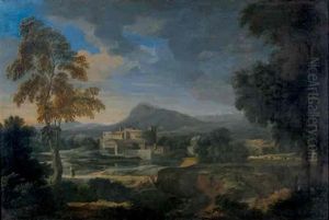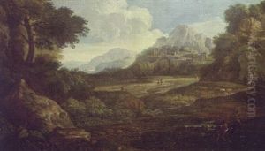 An Arcadian Landscape With Travellers On A Path, A Walled Village Beyond