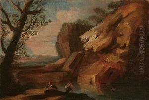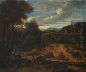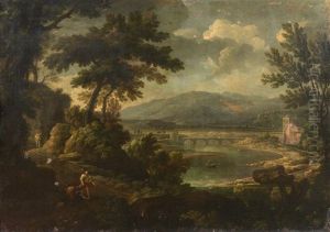 A Classical Landscape With A Fisherman In The Foreground And A Herder With Goats On The Path Beyond