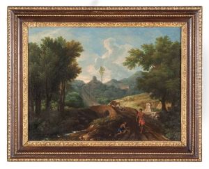 An Italianate Wooded Landscape With Figures Conversing By A Waterfall, A Castle Beyond
