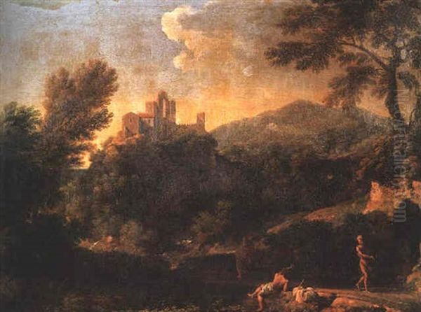 A Classical Italianate Landscape With Three Figures On A Path, A Citadel Beyond