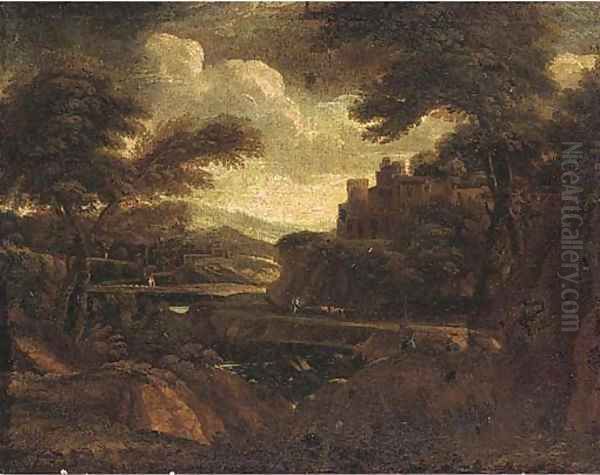 A classical landscape with figures on a river side track