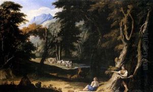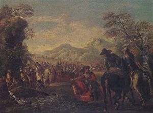 A Classical Landscape With A Fisherman, A Washerwoman, A Mother And Child And Other Figures By A River, A Waterfall Beyond