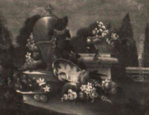 Flowers In A Stone Urn On A Pedestal, And Grapes, Figs, Pomegranates, Plums And A Mel-on In An Overturned Basket In