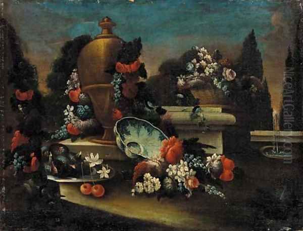 An urn with a garland of flowers, figs, cherries and flowers, in a landscaped park