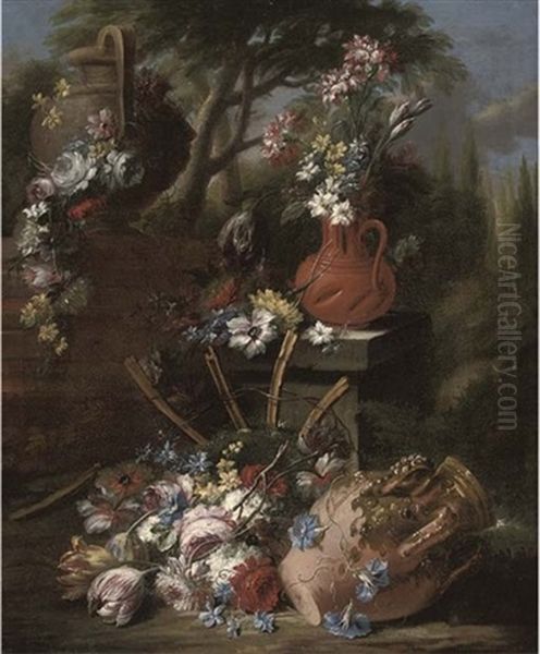 Carnations And Narcissi In An Earthenware Jug On A Stone Ledge With Roses, Convolvulus, Narcissi And Tulips On A Forest Floor By An Earthenware Urn And A Garland Of Flowers On A Stone Urn, A Wooded La