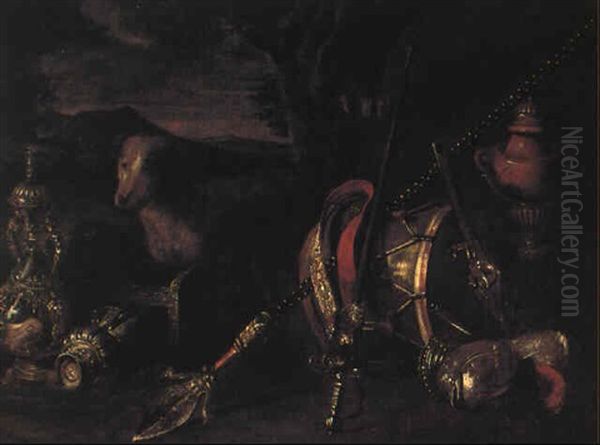 Milit,risches Ger,t Vor Einem Baum; Hund Und Landschaft Im Hintergrund
